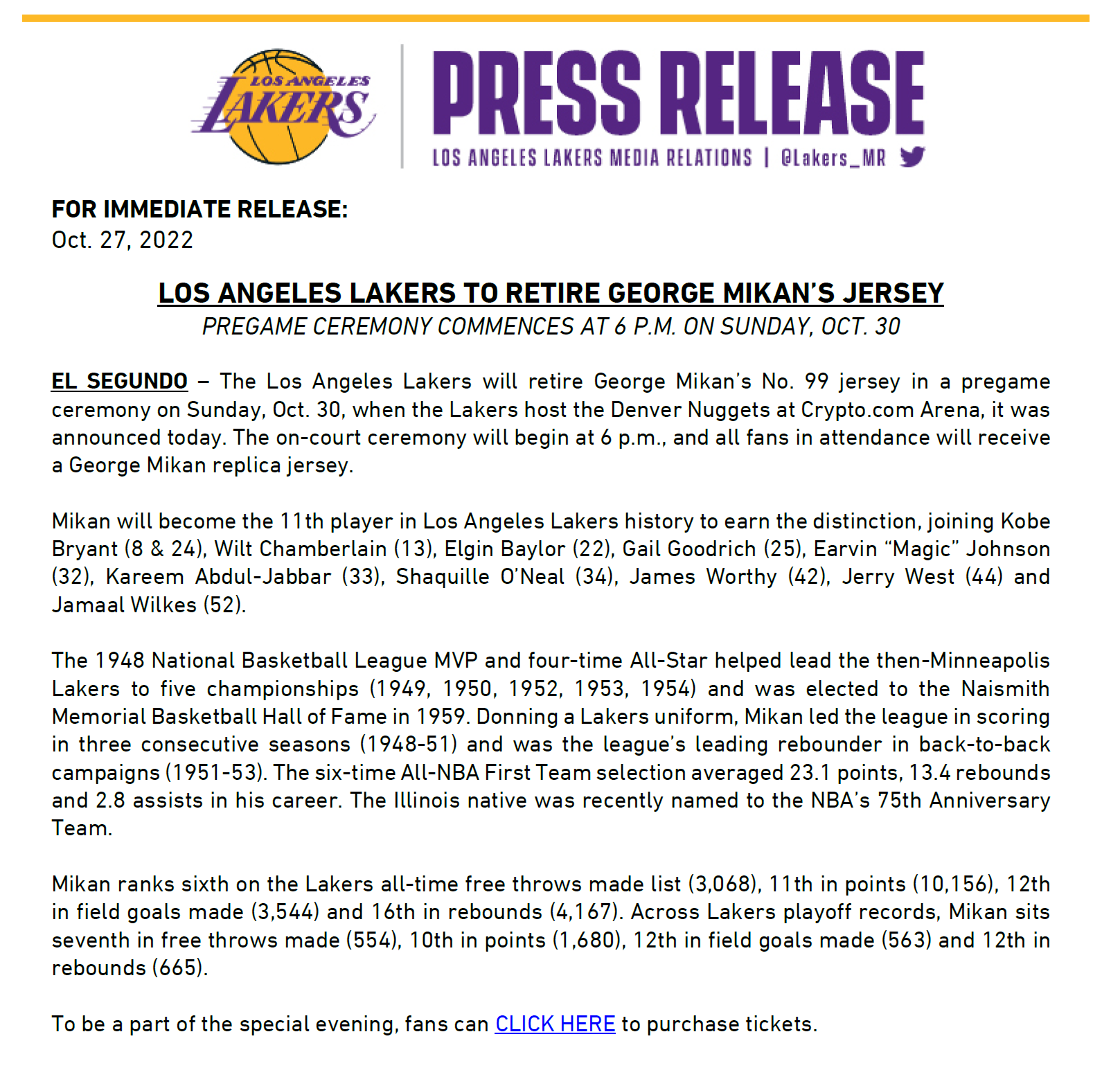 Michael Corvo On Twitter Here S The Lakers Press Release On George Mikan S Number Retirement On Sunday Https T Co Ia4vmky53c Twitter